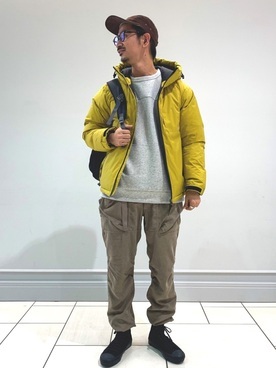 グレースウェット×イエローダウンジャケット×ベージュパンツ