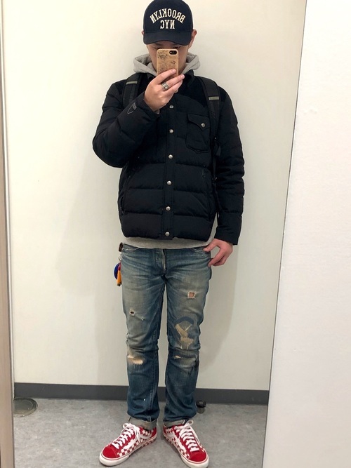 こちらは、黒のキャップに黒のシエラデザインズのダウンジャケット、デニムパンツを合わせたコーディネートです。全体的に黒でまとまっており、メンズらしい着こなしですが、足元に差し色の赤を入れることで、カジュアルな大人の遊び心のあるコーディネートに仕上がっています。
