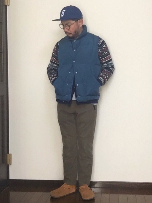 こちらは、シエラデザインズのダウンベストを使ったコーディネートです。着ぶくれしないすっきりとしたシルエットのダウンベストなので、ボーダーなどの柄物のインナーととても相性がいいです。ベストを着ることで派手になりすぎず、柄物に挑戦してみたい方にもおすすめのコーディネートです。