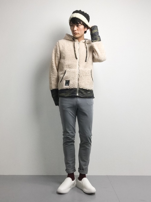 こちらは、シエラデザインズのボアフリースパーカーを使ったコーディネートです。全体的に優しい印象になり、メンズファッションでありながらも可愛い印象の着こなしとなっています。大人のカジュアルファッションにも是非、おすすめのコーディネートです。