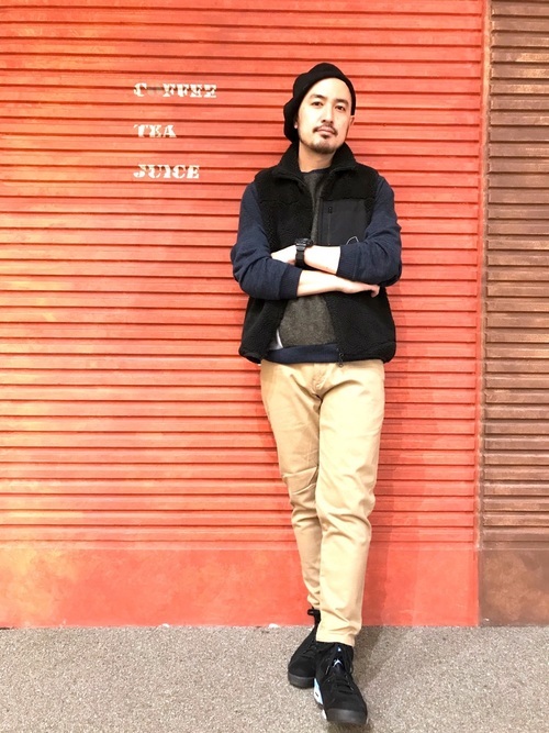 こちらは、シエラデザインズのボアフリースのベストに、すっきりとしたシルエットのスラックスを合わせたコーディネートです。ボアフリースはシルエットが大きくなりがちですが、すっきりしたパンツを合わせることで、全体がまとまったバランスのいい着こなしになります。