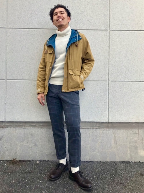 こちらは、シエラデザインズのマウンテンパーカーにシャツを合わせたコーディネートです。インナーにシャツを合わせることで、きちんと感がプラスされた着こなしになり、大人の上品なカジュアルコーデに仕上がります。