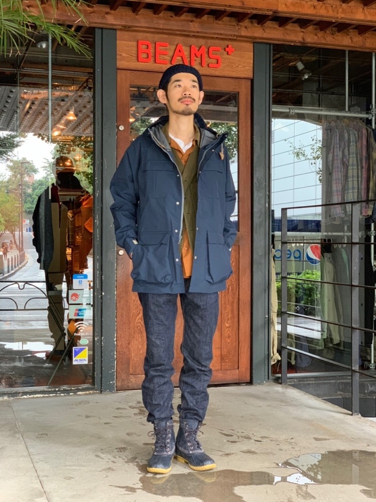 マウンテンパーカーとブーツの組み合わせはアウトドア感が強い着こなしですが、シャツやベストをインナーに合わせるとアーバンアウトドアなメンズコーデに仕上がります。アウターとボトムスなどはすべてネイビーで統一、そしてネイビーに映えるオレンジシャツで単調な印象に見えないよう、色味で変化を加えている着こなし方もさすがです。
