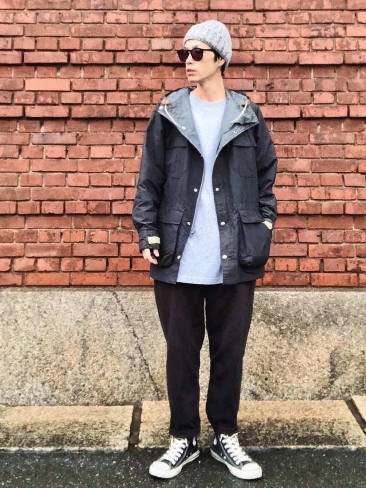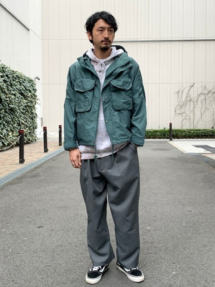 マウンテンパーカーにパーカーを合わせた、大人のアメカジ風コーデです。全体的にゆったりとしたシルエットにまとめていますが、淡いグリーンやグレーなどきれいめカラーで揃えてあげると街でも浮かない着こなしに。トップスから足元にかけてさりげなくグレーから黒へとグラデーションを作る工夫で、こなれ感のある着こなしを演出しています。