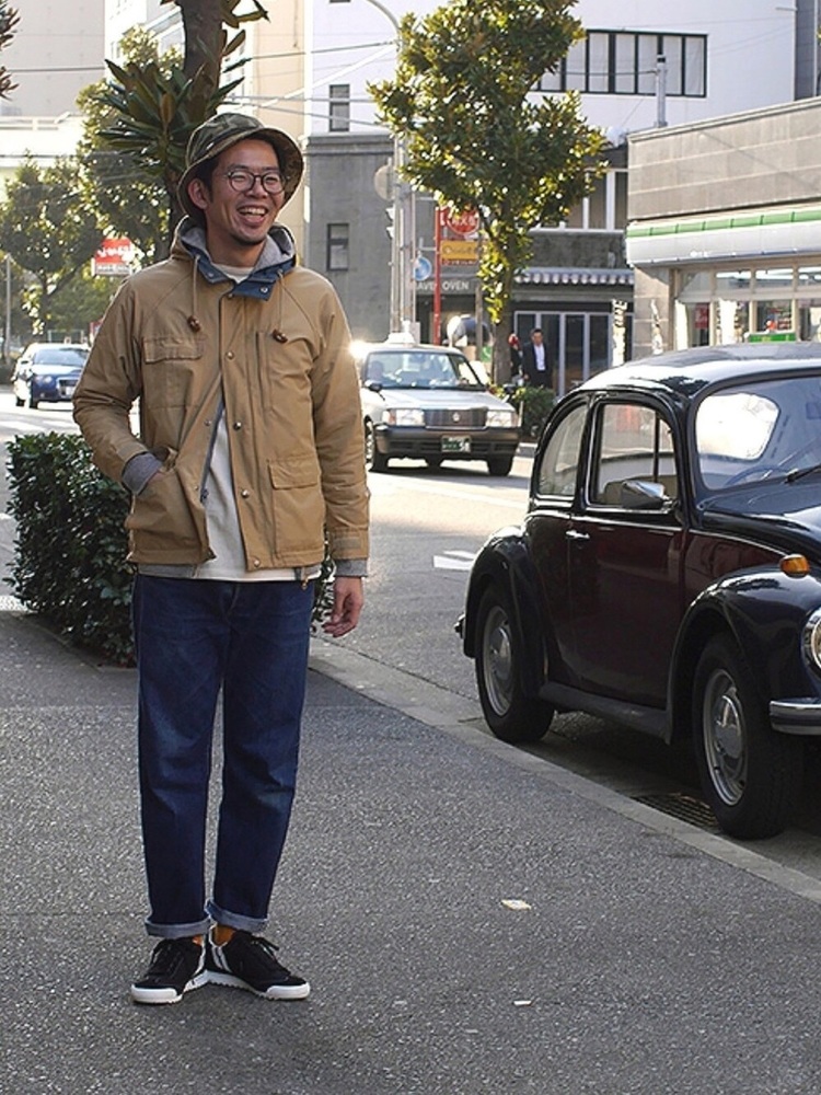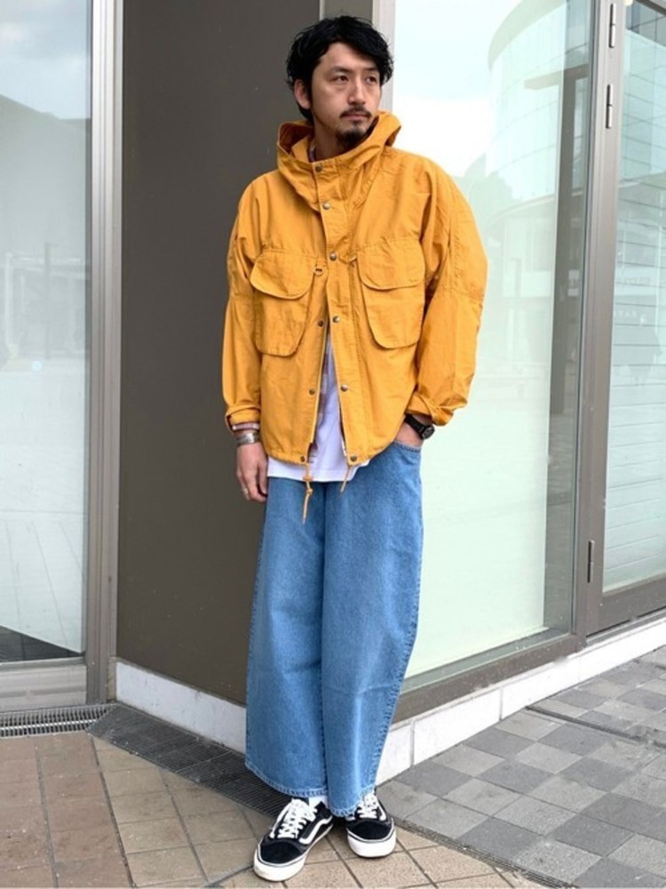 インパクトのあるイエローのマウンテンパーカーは街着として着こなしにくそうですが、ワイドデニムと合わせアメカジ風に着こなせば垢抜けたカジュアルコーデに仕上がります。足元は有彩色ではなく、引き締め効果のある黒のスニーカーでメリハリをプラス。インナーのシャツで白を取り入れ、イエローとブルーのコントラストを少し和らげています。