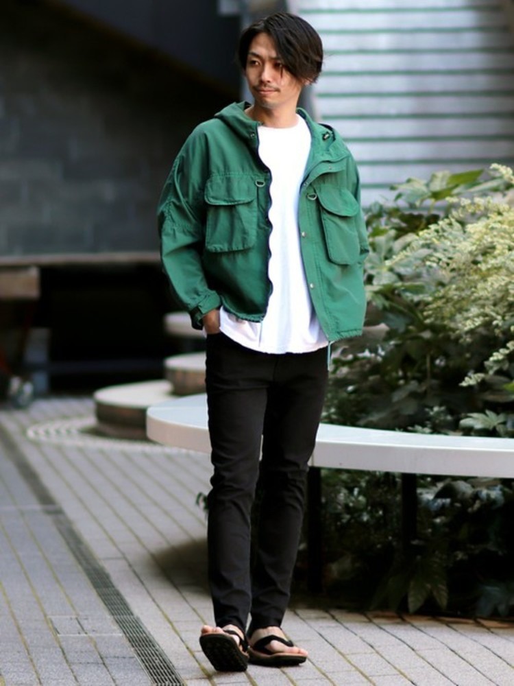 モノクロコーデの差し色に、グリーンのマウンテンパーカーを合わせたメンズコーデです。ショート丈のアウターとスキニーパンツの組み合わせは、スタイルをよく見せたいときに最適。サンダルで足元を軽やかに見せると、アウトドア感が抑えられ大人カジュアルな春夏コーデに仕上がります。