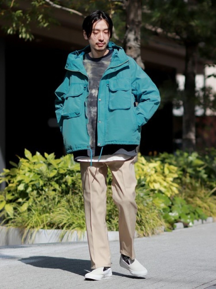 ゆったりとしたサイズ感のマウンテンパーカーですが、着丈が短めに作られているのでタックインしなくてもバランスよく着こなせます。トレンドのタイダイ柄スウェットで、着こなしに今っぽいカジュアル感を演出。ストリート感を控えめにするため、タック入りのベージュパンツと白スリッポンで品良くまとめれば、大人カジュアルコーデの完成です。