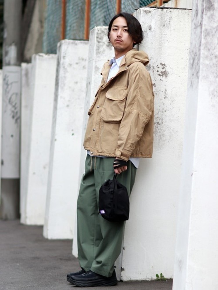 マウンテンパーカー×バンドカラーシャツ×ミリタリーパンツ