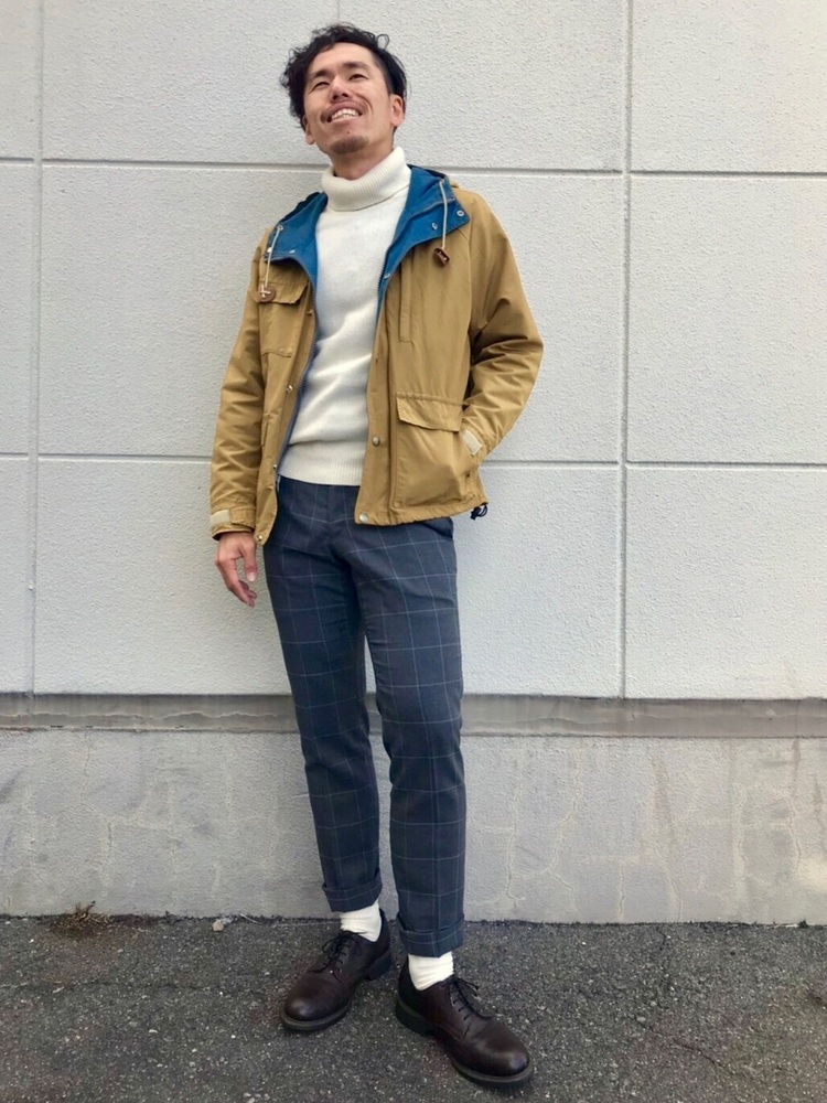 タートルネックとチェック柄パンツで、マウンテンパーカーに大人なテイストをミックスさせたメンズコーデです。アウターにのみアウトドアアイテムを合わせることで、キメすぎないこなれ感のある着こなしに。白ソックスが見えるようにパンツはロールアップし、足元をもたつかせないようにアレンジを加えています。