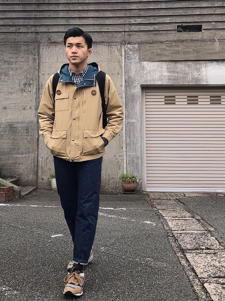 アースカラーアイテムで統一し、大人カジュアルにまとめたメンズコーデです。バッグとスニーカーにのみ黒を取り入れることで、軽快な着こなしに。ベージュのマウンテンパーカーのインナーに合わせた、薄いブルーのストライプシャツが大人っぽさと爽やかさを加えてくれています。