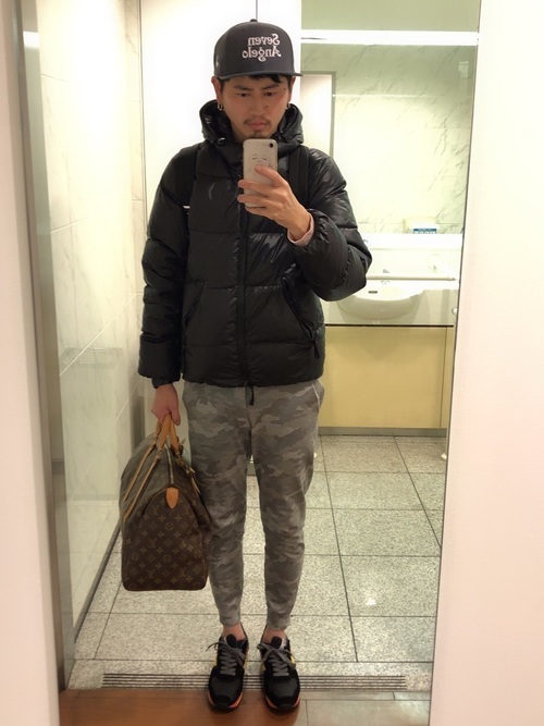 迷彩柄のパンツを主役に持ってきたデュベティカのダウンを使った着こなしです。ダウン自体は細身で都会的なシルエットなのでほかのアイテムを主役にすることも可能。こちらのメンズコーデのようにおしゃれを最大限楽しむことができます。アウターサイズはボリュームが出すぎない46でミニマルにまとめましょう。