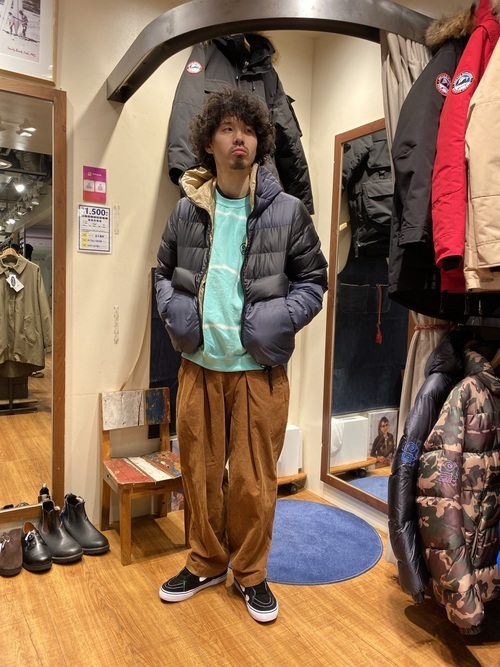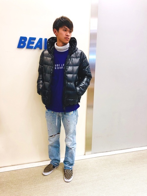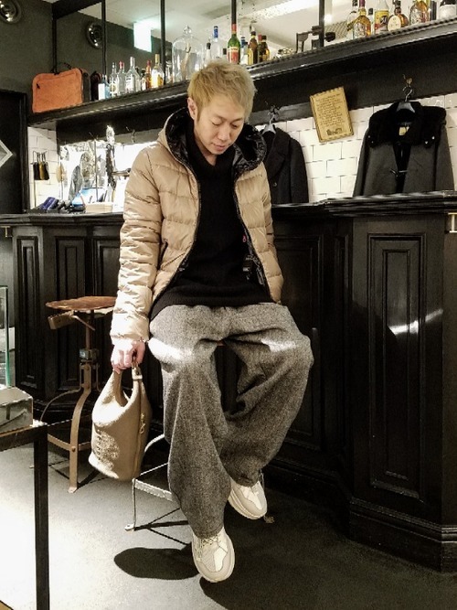 デュベティカのダウンはコーデ全体のカラーの引き締め役を担うことも可能です。こちらはカラーを多く使った着こなしですが、ガチャガチャした印象にならずにきれいにまとまっているのでおしゃれなセンスを感じさせます。アウターは前を開けて着るのでこちらもサイズ48をセレクトしています。