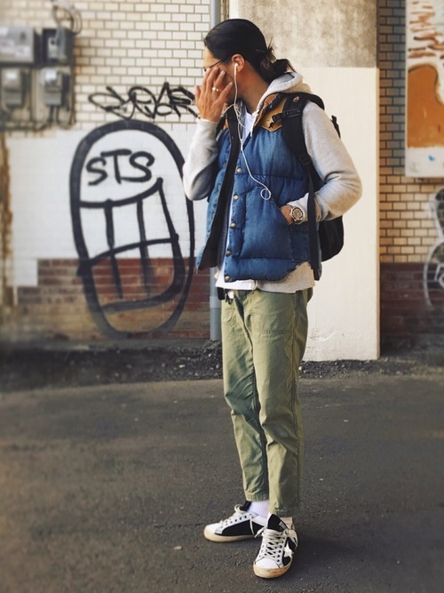 ダウンベストのレザーとデニム生地に、相性抜群なカーキのカーゴパンツを合わせたカジュアルコーデ。パーカーとスニーカーはホワイト系で抜け感を出し、ダウンベストが引き立つ、爽やかな着こなしになっています。