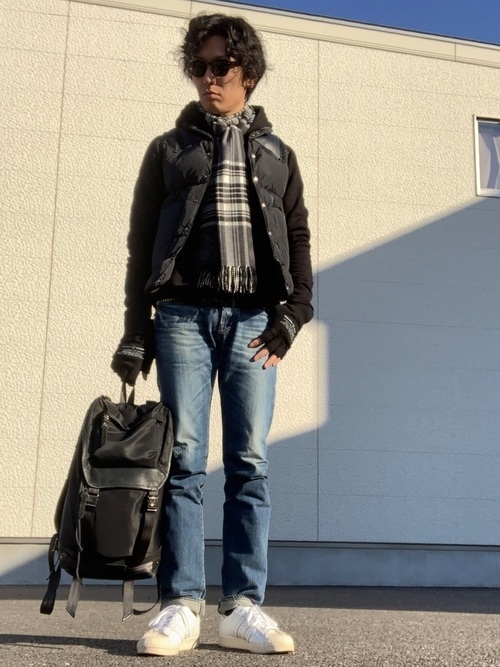 デニム ダウンベスト×カーゴパンツ