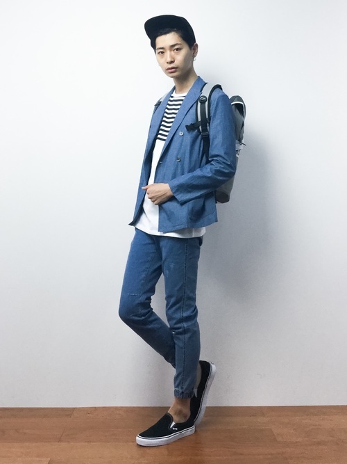 デニムパンツとボーダーTシャツに、リュックを背負った軽快さがあるメンズコーデです。ボーダーTシャツにジャケットを羽織ることでカジュアル感を少し抑えたきれいめの着こなしになっています。リュックはコーデと同じ淡い色味で、まとまりのあるキレカジコーデに。
