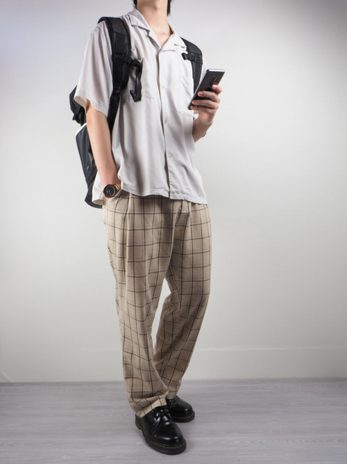 チェックパンツとオープンカラーシャツに、黒のリュックを合わせたメンズコーデです。全体的にゆったりとした装いなので、足下は革靴でメリハリを。リュックを着用していますが、それぞれのアイテムに若干のクラシカルさがあるのでカジュアルになりすぎずきれいにまとまっています。
