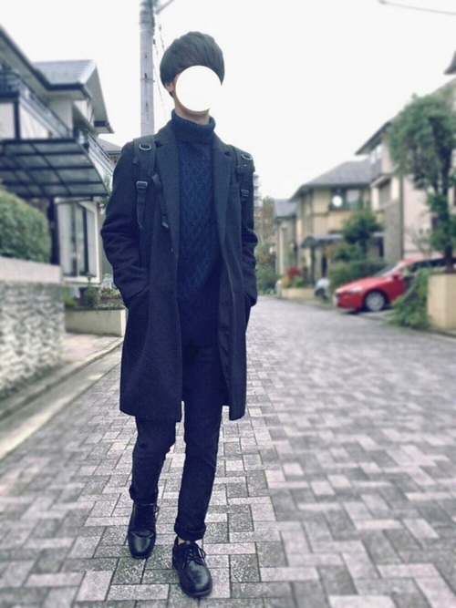 チェスターコートにリュックを背負った、冬らしいスマートなメンズコーデです。暗い色で合わせているので、インナーはケーブルニットで動きのあるアイテムをチョイス。あえてリュックを合わせることで、少し外したこなれ感のある着こなしになっています。