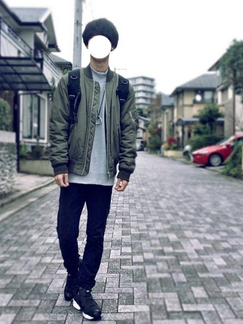 ブラックパンツとMA-1にリュックを背負ってミリタリー感を上手く活かしたメンズコーデです。インナーにグレーのスウェットを合わせラフさを足して、ジャケットの雰囲気を後押ししています。鞄はボリュームのあるリュックで今っぽさがある装いに。
