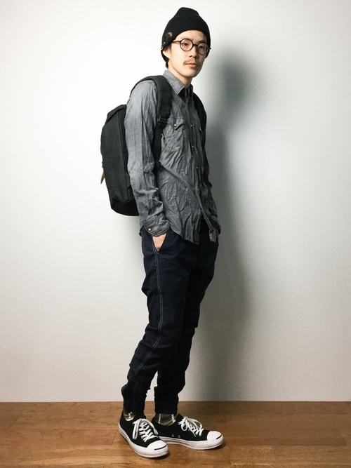 同色系でまとめたコーデにリュックを背負ったスタイリッシュなメンズコーデです。スリムなパンツにシャツという王道コーデですが、濃い色で合わせることでカジュアルではなくシックな印象に。あえてリュックでカジュアル感を足して、少し柔らかい雰囲気をプラスしています。