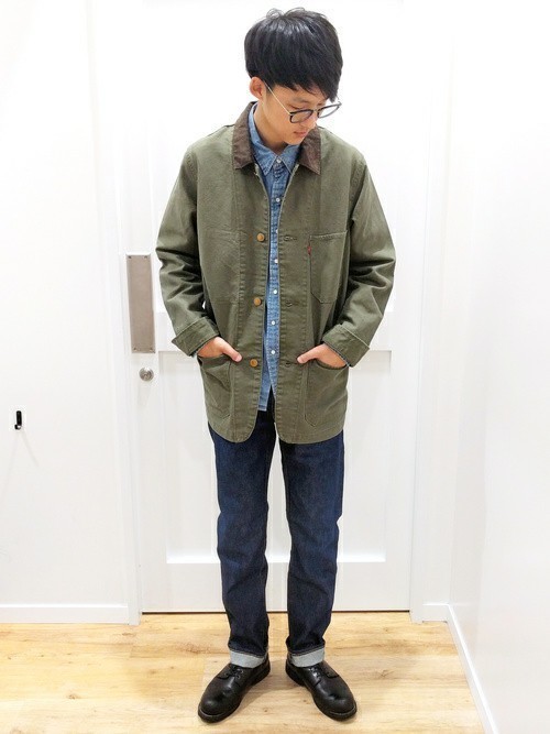 リーバイス511×デニムシャツ×ジャケットを組み合わせたメンズコーデもなかなか。デニム×デニムのコーデも、アウターにカーキジャケットをプラスすることで、ナチュラルなニュアンスに仕上がります。ジーンズの裾はロールアップしてこなれ感を、黒のシューズで全体のコーデをスッキリとまとめれば、ワンアイテムが効いた技ありコーデの完成です。