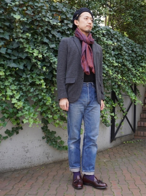 リーバイスの501ジーンズに、ハンチング帽×テーラードジャケット×ストールを合わせたメンズコーデ。ジーンズの裾はロールアップし、こなれ感を演出しています。黒のトップスにグレーのジャケットのシンプルなスタイルに、ハンチング帽や華やかなストールをプラスすることで、一気におしゃれ感漂う着こなしに。