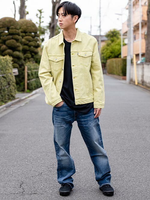 ヴィンテージ感漂うリーバイスの569ジーンズに、Tシャツ×カラーデニムジャケットを合わせたメンズコーデ。パッと明るいイエローカラーのデニムジャケットを羽織ることで、アクセントの効いた着こなしになります。ジーンズの色落ち加減が程よい抜け感を作ってくれるので、おしゃれ感がさらにUP。