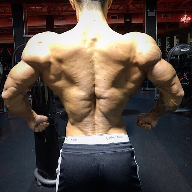 背中から見てもわかるほど、肩の筋肉がかなり大きく発達しています。