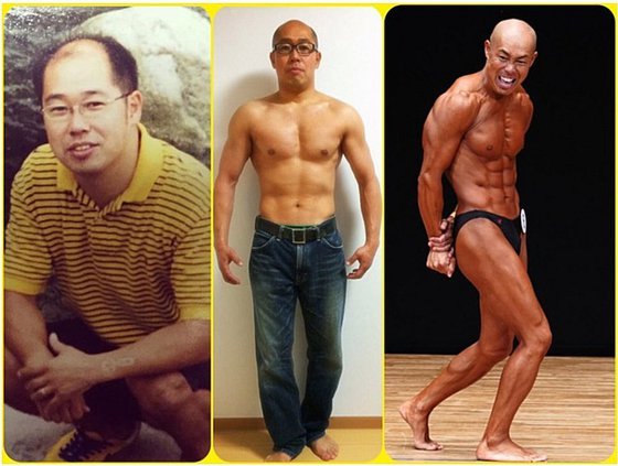筋トレ開始し2か月の写真が真ん中、そこから4年後の写真が一番右の写真です。何歳になっても継続的な筋トレを続ければ、どんな身体にでもなれるということがわかります。