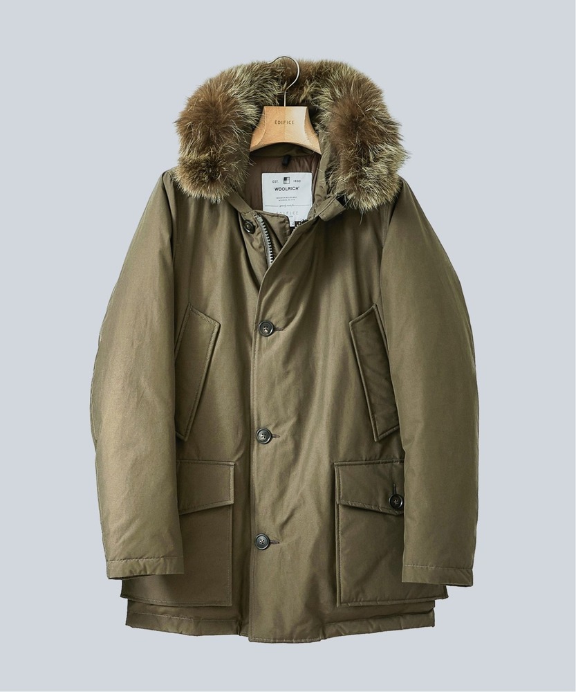 ウールリッチを代表する名品、アークティックパーカーをベースにアップデートした、EDIFICEの別注モデルです。従来のナチュラルカラーのファーをピースダイのファーに変更し、裏地や付属のホワイトボタンをベースカラーと親和性の高いカラーに統一することで、より大人っぽくエレガントな雰囲気に。