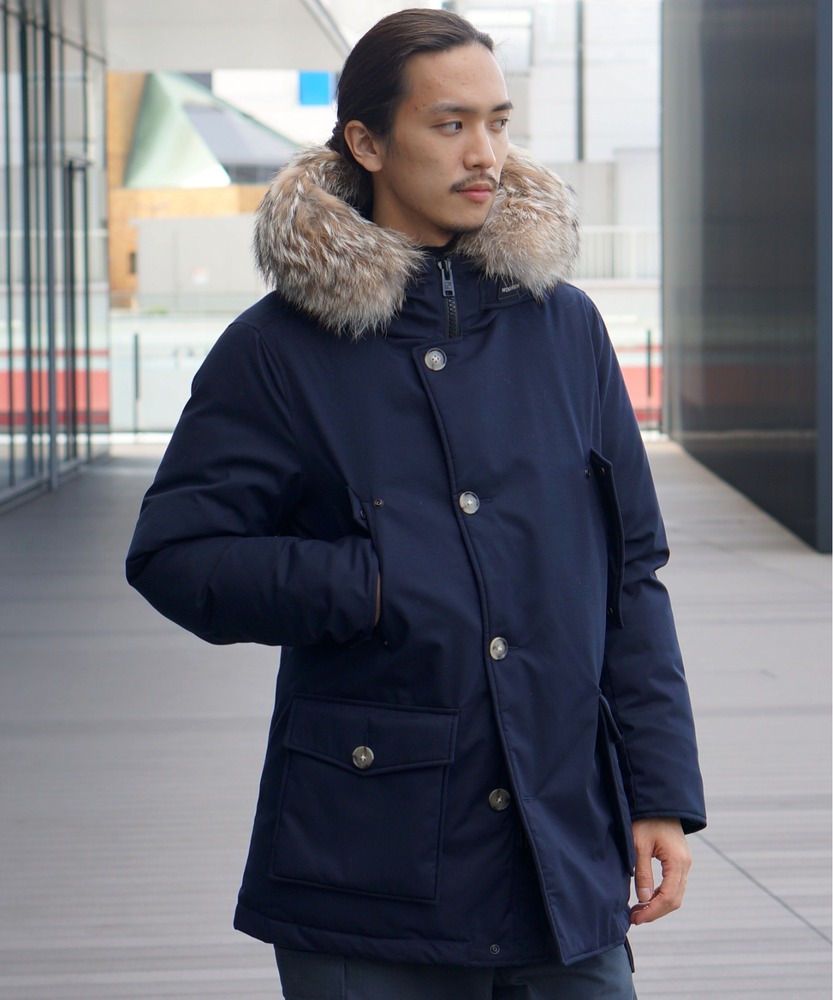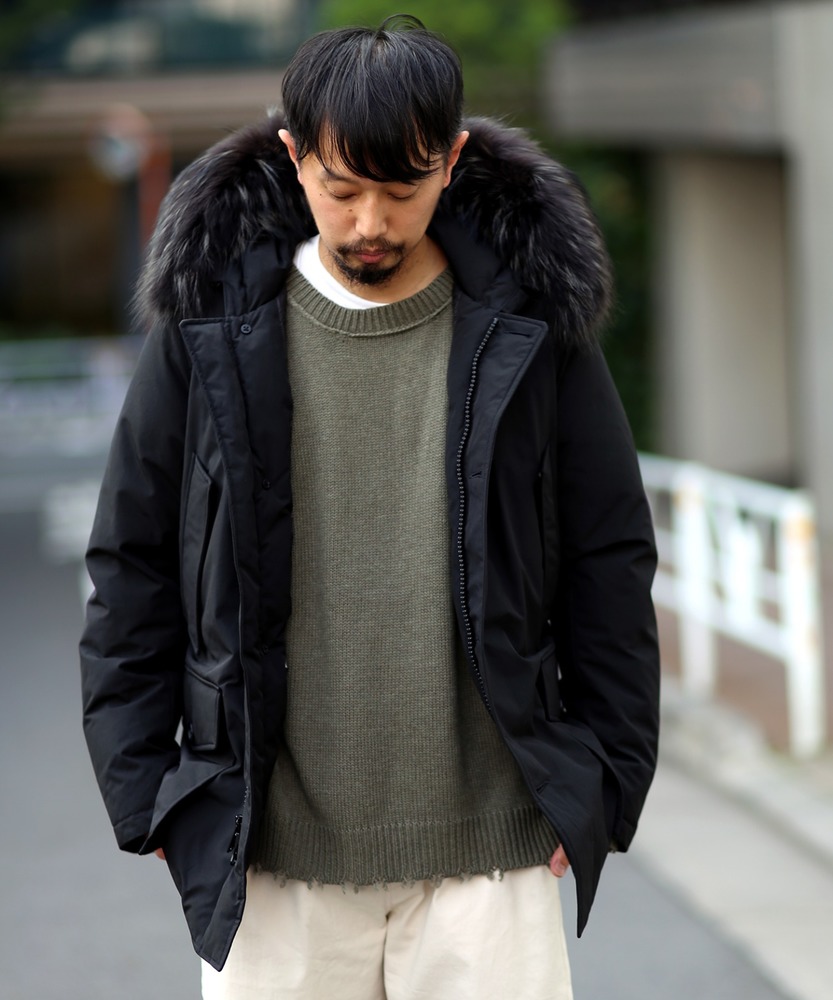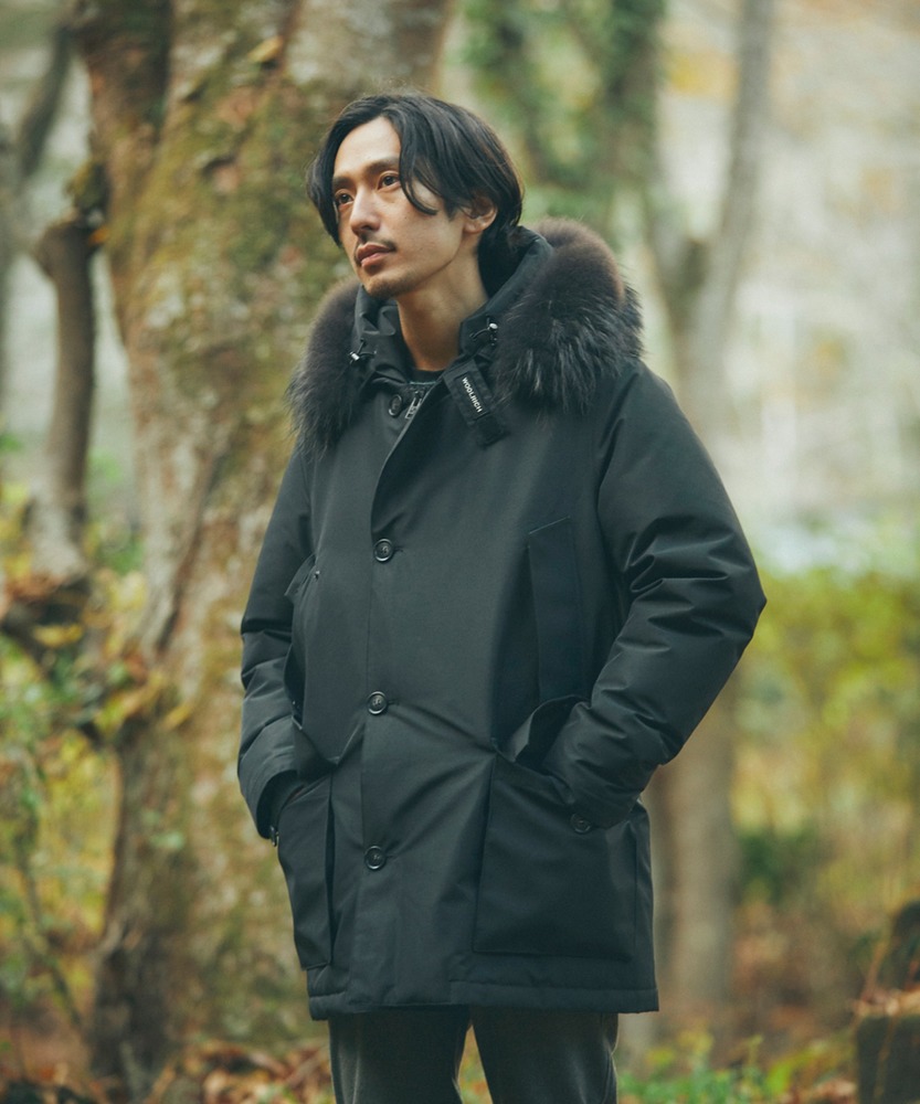 ウールリッチの「ARCTIC PARKA HI COLLAR」をベースに、温かみのあるウールをブレンドし、制作した別注モデル。身体のラインに沿ったやや細身のすっきりとしたシルエットで、ウールリッチらしいクラシックかつモダンなダウンコートに仕上がっています。