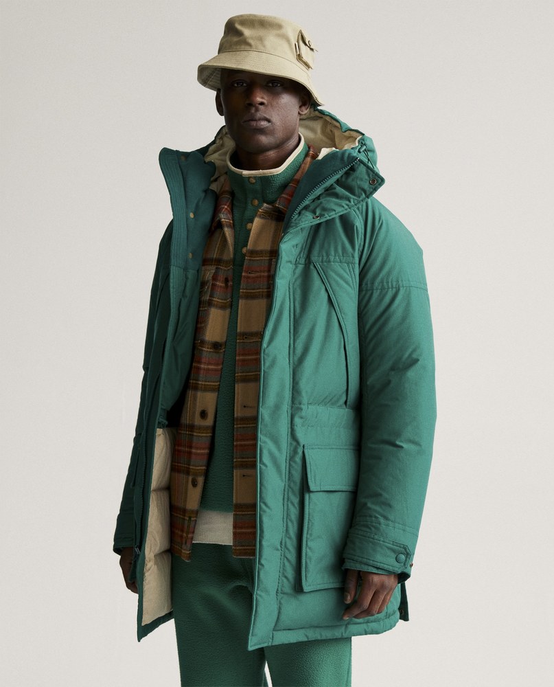 アーカイブのバリスティックマウテンパーカーをベースに、ニューヨークを拠点とするファッションブランド「Aimè Leon Dore(エメ レオン ドレ)」のエッセンスを盛り込んだメンズダウンコートです。ハイネック仕様で、フード周りにドローコードが入っています。実用性の高いポケットと大きめのフードもポイントです。