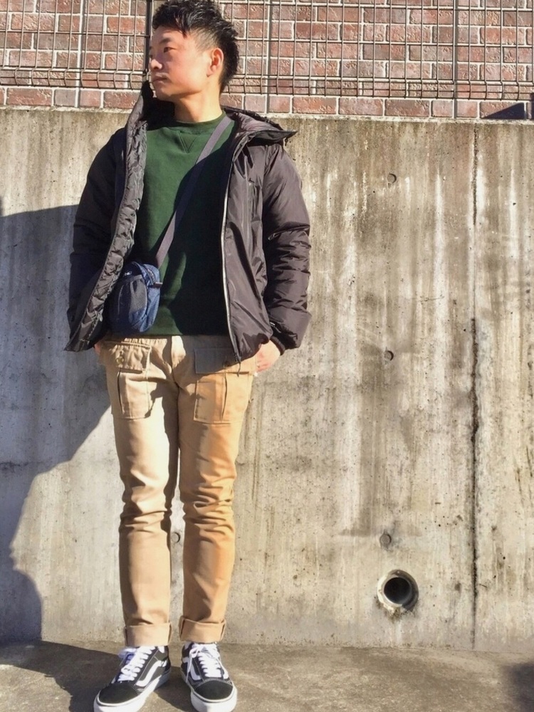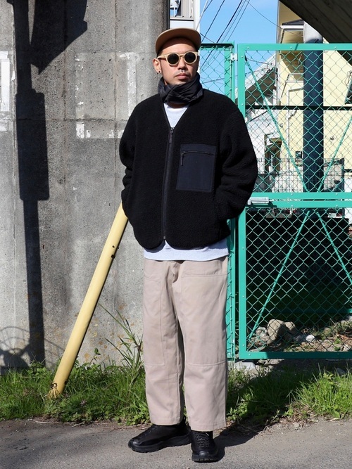 タフな仕様になっているワークマンのチノパンと、ミリタリージャケットとを組み合わせたメンズコーデです。全体的に少しワイドに着こなせば、今風のシルエットが完成します。もちろん、このままアウトドアとしても活用できる着こなしのため、ワークマンのチノパンを持っておけばメンズコーデの幅が広がるでしょう。