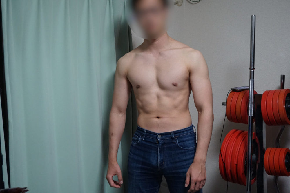 この方は大胸筋と僧帽筋が肥大し、逆三角形の素晴らしい見た目になっていますね。ベンチプレス100kgを達成した時の体つきを撮影し、さらなる筋トレに励んでいます。
