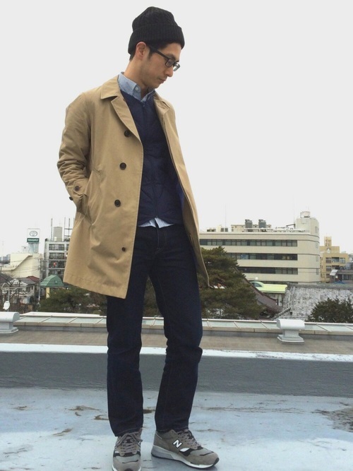 ノースフェイスのインナーダウンベストを中に着こんだキレイめな着こなしです。薄手のインナーダウンなのでコーデの邪魔をせず、それどころか上品なスーツのベストのようなイメージになりますね。ニット帽とスニーカーでキレイにまとまり過ぎないようにカジュアルダウンしています。