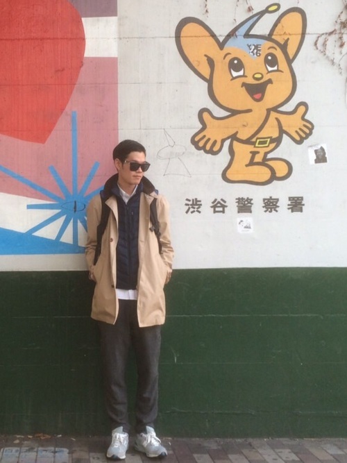 コートの下にノースフェイスのインナーダウンベストを重ね着したコーデです。ベストの裾からのぞくシャツの白が全体に軽やかさを与えてくれます。無難にまとまり過ぎないように、足元のスニーカーとサングラスでカジュアルダウン。さまざまなシーンで活躍しそうな着こなしです。