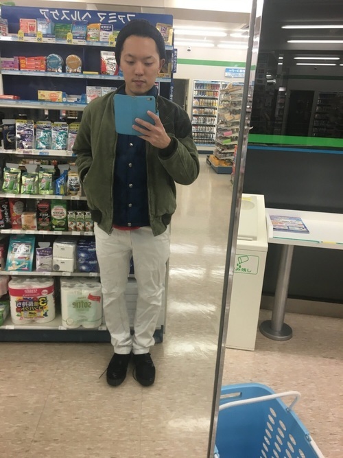 寒い季節の重くなりがちなカラーも、白のパンツを投入することで一気に明るくなります。ノースフェイスのベストの裾からはインナーの赤がチラリ。防寒しながらもスッキリとした着こなしにまとまっています。