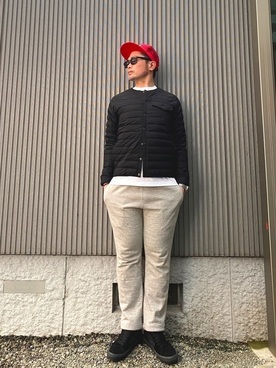 きれいにまとまったコーデに、赤いキャップがポイントです。スウェットにキャップというスポーティなアイテムなのに、どこか落ち着いて見えるのはアウターに着たノースフェイスインナーダウンの質感のおかげ。楽ちんで温かなのにラフ過ぎない、そんなわがままに応えてくれる着こなしです。