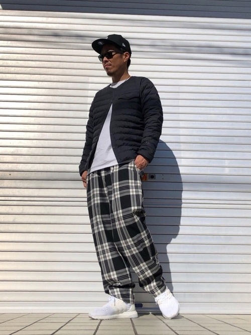 インパクトのある大き目なチェックのパンツを主役にしたのがこちらのコーデです。パンツを引き立たせるために他のアイテムは落ち着いたカラーリングでまとめています。チェックの存在感がちょうど良い具合に引き立っていますね。