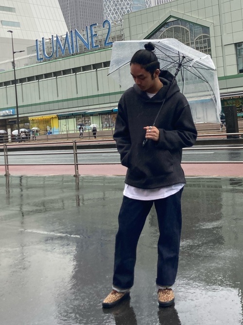 パーカーとフルカウントのジーンズの組み合わせもおすすめです。黒のシンプルなパーカーに、スリムフィットなフルカウントのジーンズがすっきりとマッチして、タウンユースにオススメのコーディネートになっています。