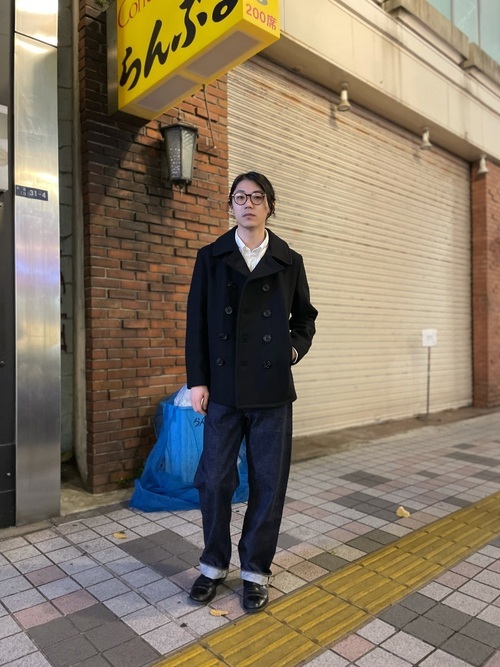 こちらは、シンプルにピーコートとフルカウントのジーンズを合わせたコーディネートです。シンプルなコーディネートも、フルカウントのジーンズなら存在感を保ちつつ、とても馴染んでいます。すっきりとシンプルに着こなしたい方におすすめです。