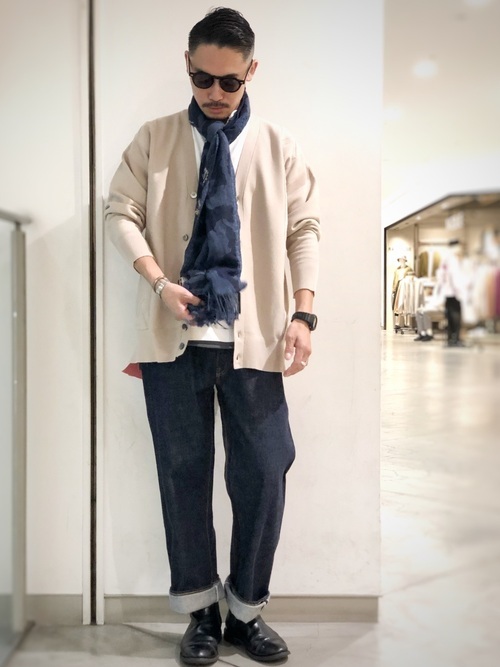 こちらは、カーディガンにフルカウントのジーンズを合わせたコーディネートです。アクセントのマフラーがとてもおしゃれな印象のカジュアルなコーディネートに仕上がっています。こちらのコーディネートのように、フルカウントのジーンズはざっくりとした大きめのカーディガンにもしっかり馴染みます。
