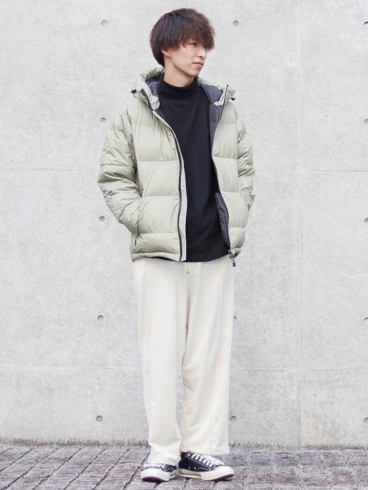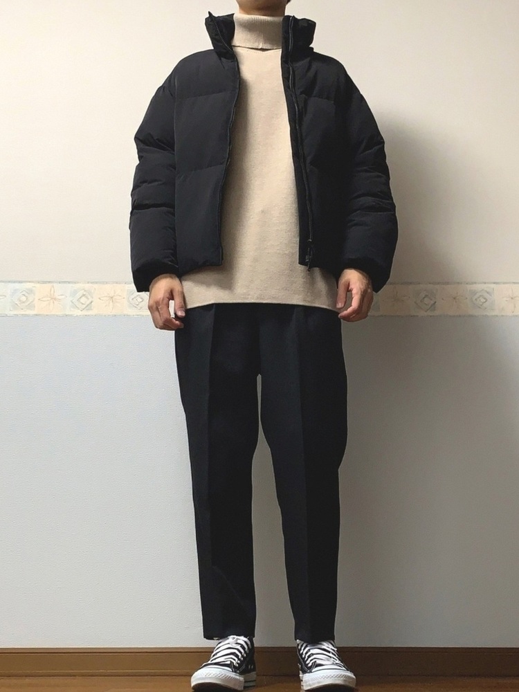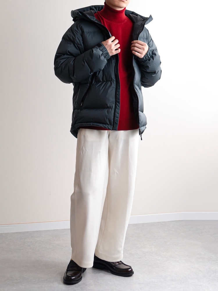 ラフな印象になりがちな黒のダウンジャケットに、赤のタートルネックを合わせた大人なカジュアルコーデです。ワイドパンツでAラインシルエットを作れば、ぬけ感も生まれます。また、ボトムスの白で赤のインパクトを柔らげ、清潔感を持たせている工夫も真似したい着こなしです。