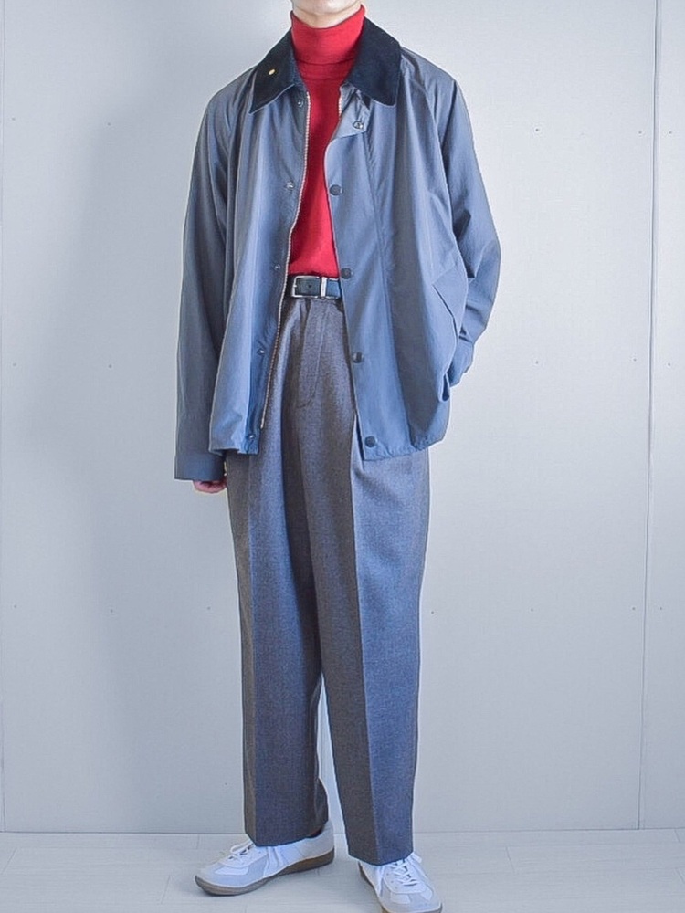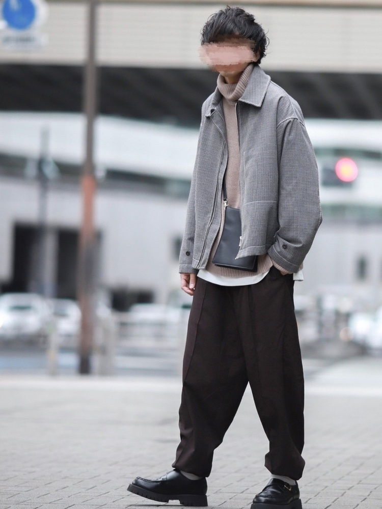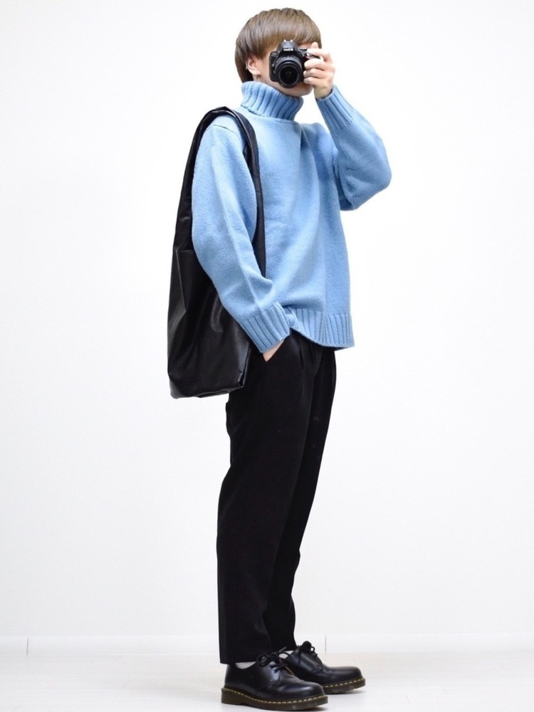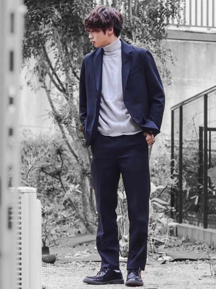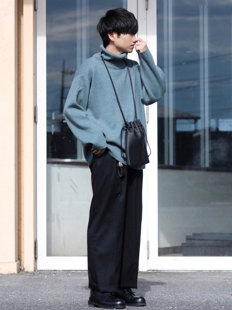 くすみ系ブルーのタートルネックは、着こなしに今っぽさを加えてくれる効果があります。ワイドシルエットのスラックスはドレスシューズでスマートさを加え、だらしなく見えないよう調節することがポイントです。