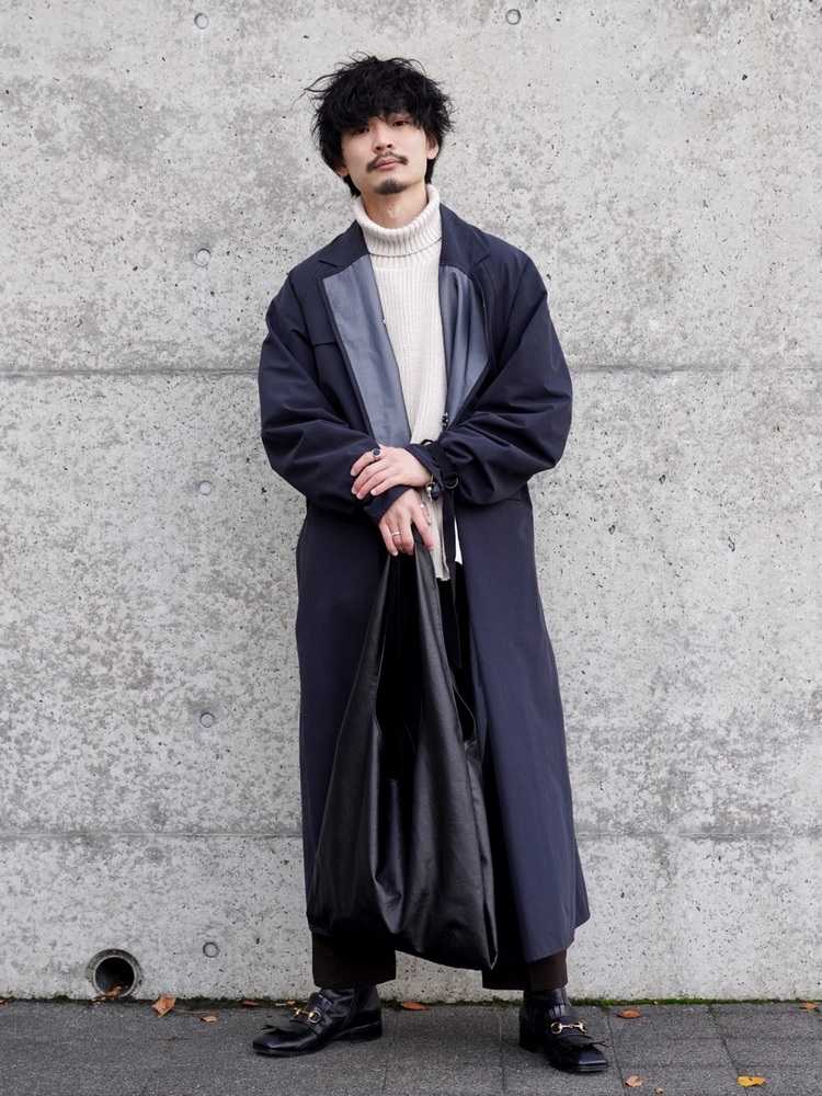 ロングコートをアウターに合わせた大人コーデです。ダークカラーのロングコートが持つモード感の強さを、白のタートルネックで緩和。フェイクレザーのトートバッグとローファーのツヤ感が、着こなしに高級感も加えてくれています。