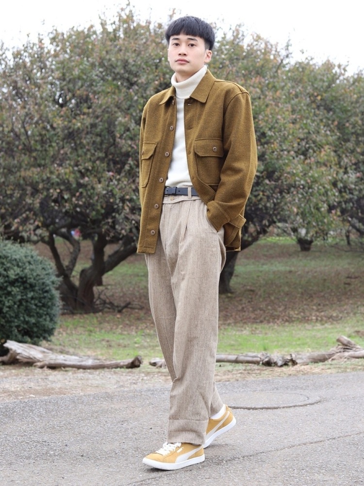 マスタードイエローとブラウンをベースにまとめ、秋らしい季節感を高めたメンズコーデです。タートルネックはタックインし、腰回りをスッキリさせることが、ゆったりめなシャツジャケットをスマートに着こなすコツ。マスタードイエローのスニーカーで、足元から華やかに見せる着こなし方も参考になります。