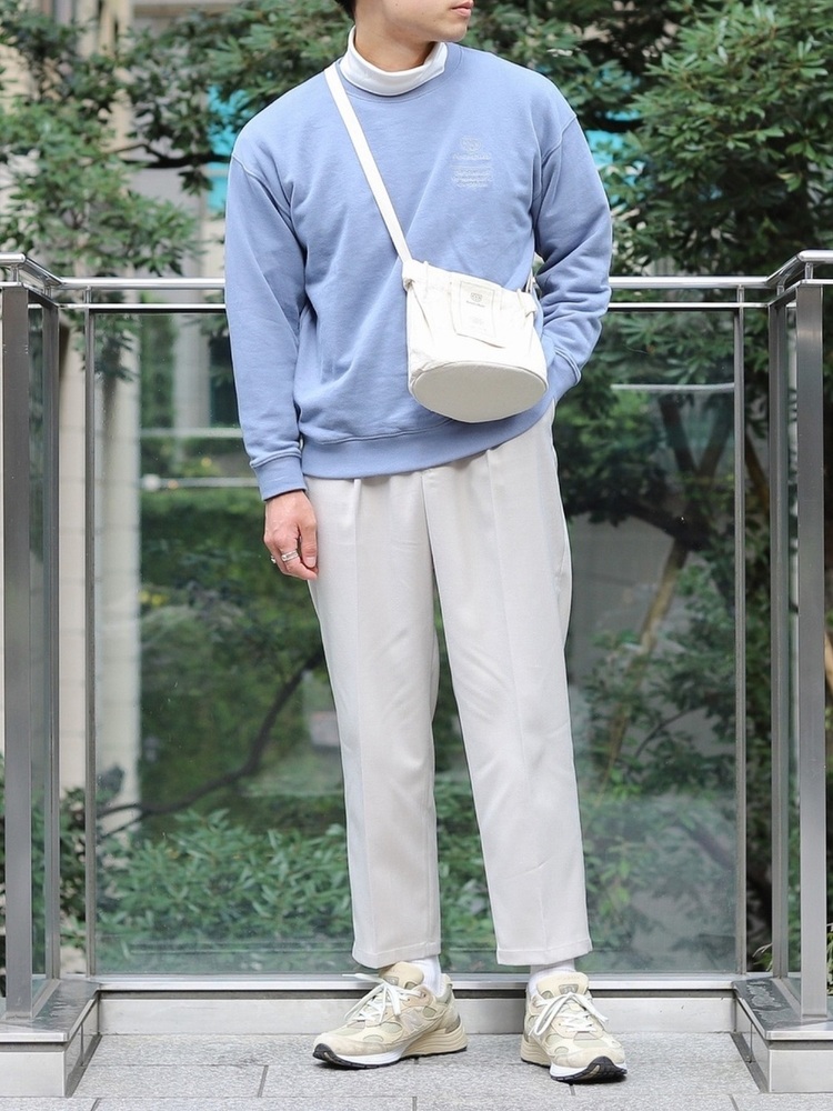 白のタートルネックをスウェットと重ね着した、カジュアルコーデです。明るいトーンのアイテムを組み合わせ、清潔感のある着こなしに仕上げています。シルエットが太めのリラックスパンツは、アンクル丈で着こなすことでぬけ感をプラス。斜め掛けにした巾着バッグも、着こなしに今っぽさを演出してくれています。