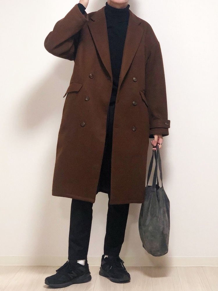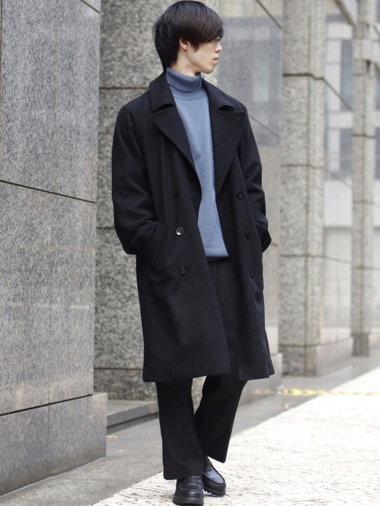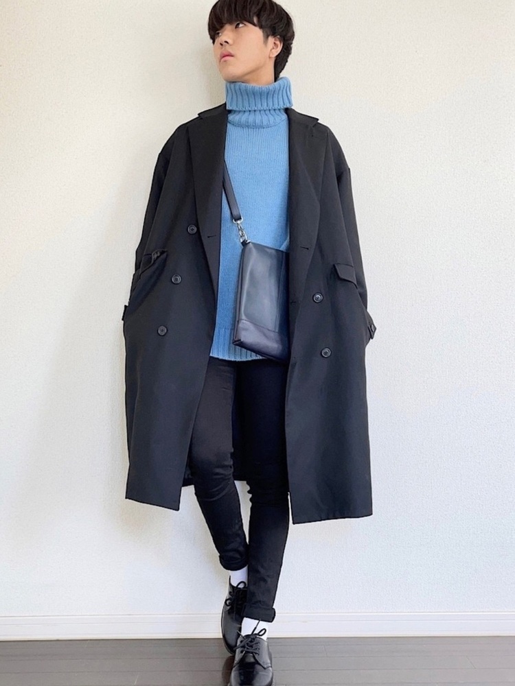 インナーのタートルネック以外はすべて黒のアイテムでまとめた、きれいめカジュアルコーデです。ロング丈のアウターにはスキニーパンツを合わせ、王道のAラインシルエットを形成。シンプルですが、シルエットのバランス感を計算した着こなしに仕上がっています。