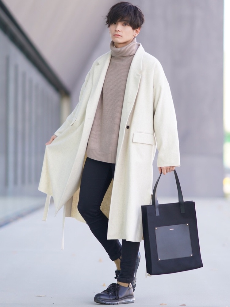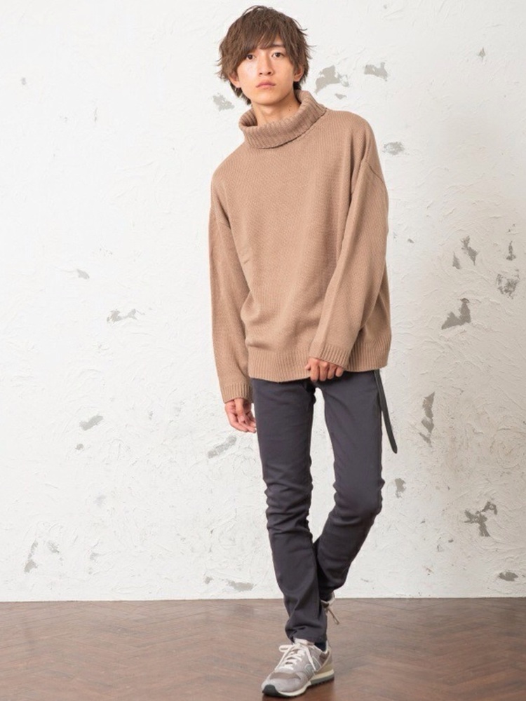 ビッグサイズのタートルネックをトップスに合わせたメンズコーデは、秋の季節にぴったりな着こなしです。スキニーパンツを合わせシャープに引き締めることで、シルエットにメリハリが生まれています。グレーやベージュを中心にニュアンスカラーで統一し、柔らかい印象へまとめていることもポイントです。