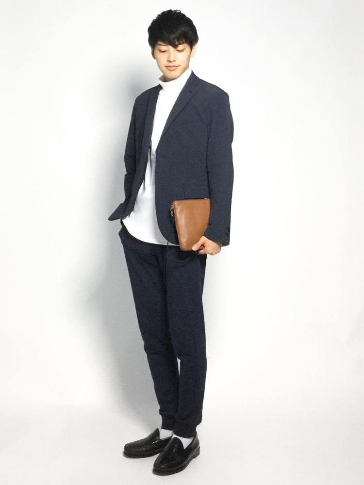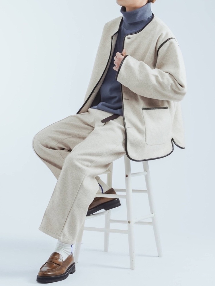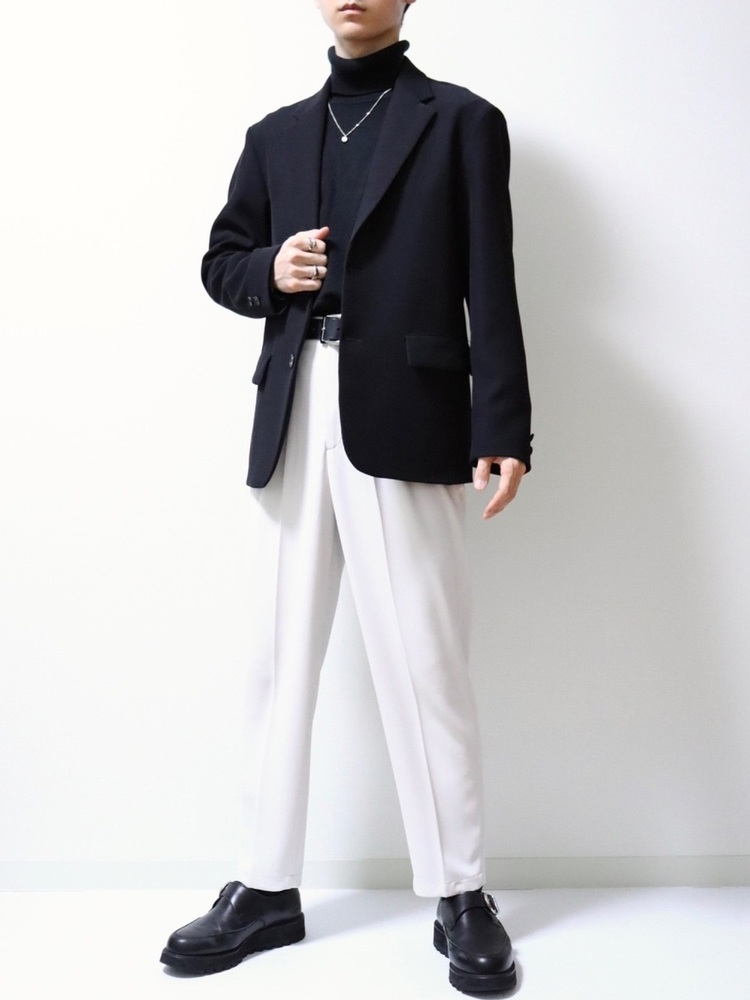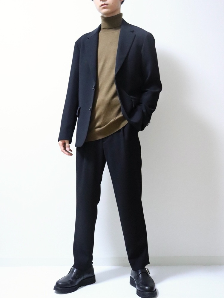 ブルータートルネック×ノーカラージャケット×ワイドパンツ