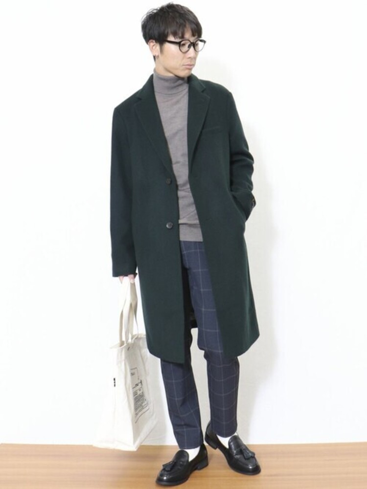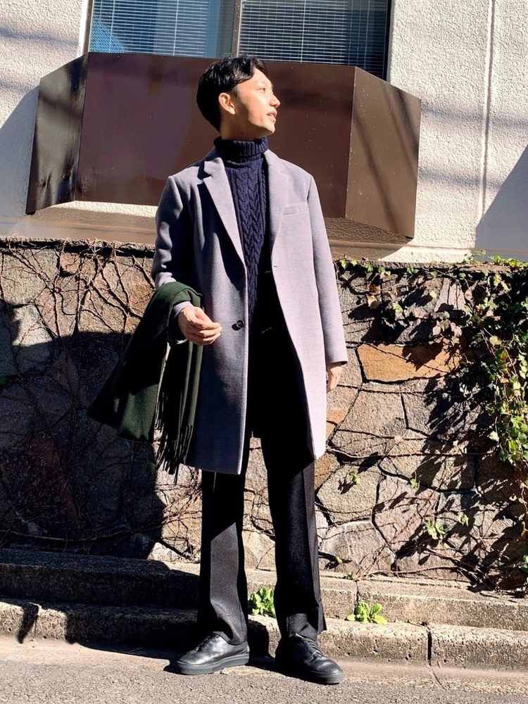 タートルネックとチェスターコートの組み合わせは、上品なコーデを作りたいときに最適です。足元はスニーカーですが、裾が広がったフレアパンツで大人なエレガントさをキープ。ネイビーと相性のいいグリーンのストールを巻けば、ワンランク上の着こなしに。年齢問わず真似したいメンズコーデです。